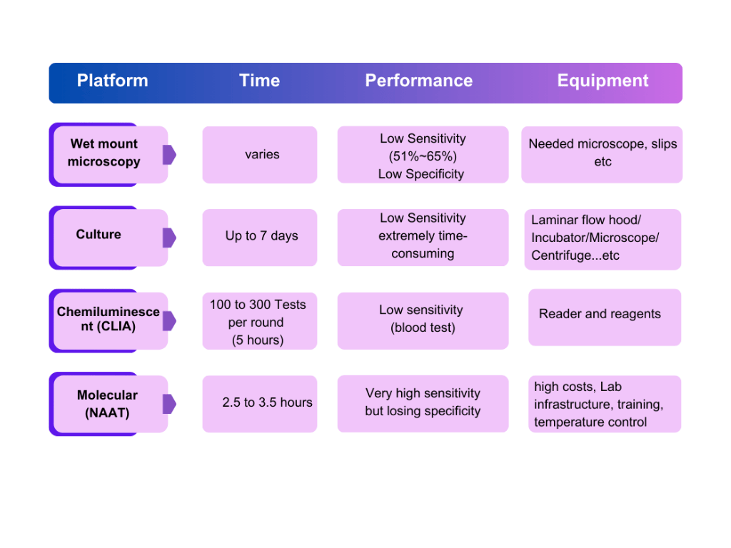 Many infections are asymptomatic, making symptom-based diagnosis unreliable. Laboratory-based testing often requires specialized equipment and time for result reporting, which may delay treatment decisions. In addition, accessible point-of-care diagnostic options are still limited in many healthcare settings.